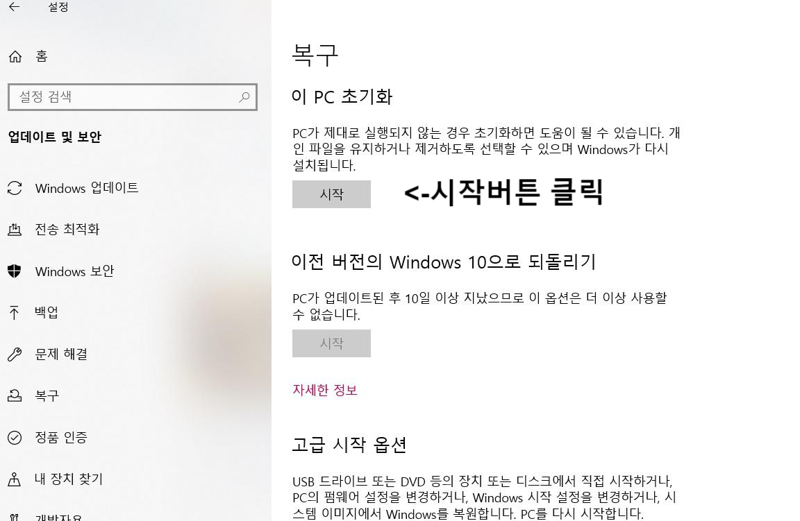 4. 이 PC 초기화 부분에서 시작 클릭