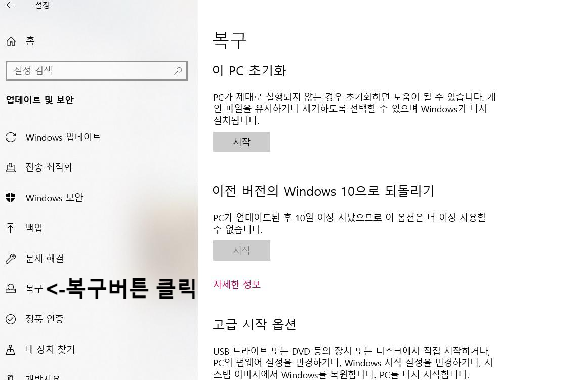 시작버튼 -> 톱니바퀴(설정) -> 업데이트 및 보안 클릭